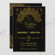 A bold and elegant black and gold wedding invitation card featuring exquisite Islamic-inspired geometric and floral patterns.