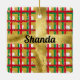 Luxury metallic Christmas ornament of traditional colours or classic Christmas colours, but with a shine. I love this ornament as a gift name tag, especially if you’re using red and green plaid gift wrap or bags. This has a metallic sheen on the design with the gold ribbon and gold stars, but it is not a foil.