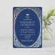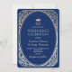Elegant and formal, this navy blue and gold wedding invitation features a royal monogram with a gold crown, surrounded by intricate foil-style botanical borders. Perfect for a luxurious, traditional wedding celebration, it highlights the couple's initials and event details with classic typography. Ideal for formal black-tie affairs or upscale evening weddings. Customise with your own names, date, and location for a timeless, regal touch.