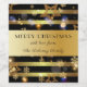 Festive personalised wine label design featuring shiny glowing snowflakes and stars on a gold and black striped background with an area for your text.