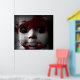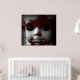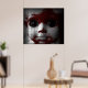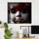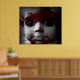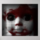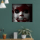Super creepy close-up of a washed out dolly face with red blood splotch stains on her skin. She has big round eyes and tiny little lips to add to the creepiness. Sure to give you chills.
