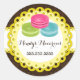 © 2014 Socialite Designs. Elegant macaron bakery sticker design incorporating a chocolate brown damask pattern background, yellow scalloped border banner for your text, and stacked macarons inside a circle. All design elements can be resized, moved, resized or deleted to suit your requirements.