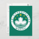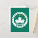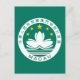 The regional emblem features the same design elements as the regional flag of Macau in a circular setting. The outer white ring is shown with the caption of the official name of the territory in traditional Chinese characters (as opposed to the simplified form): "中華人民共和國澳門特別行政區" (Macau Special Administrative Region of the People's Republic of China) and the Portuguese short form, "Macau".