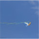 A photograph of a colourful macaw bird kite with ribbons floating in the wind coming from its wings, flying high in the summer blue sky. Photograph Copyright ©Kimberly J Tilley.