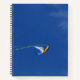 A photograph of a colourful macaw bird kite with ribbons floating in the wind coming from its wings, flying high in the summer blue sky. Photograph Copyright ©Kimberly J Tilley.