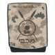 A military brown "subdued" style depiction of a Maccabee's shield and two spears on a desert camo background. The shield is adorned by a lion and text reading "Yisrael" (Israel) in the Paleo-Hebrew alphabet. Modern Hebrew text reading "Maccabee" also appears. Add your own additional text.