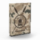 A military brown "subdued" style depiction of a Maccabee's shield and two spears on a desert camo background. The shield is adorned by a lion and text reading "Yisrael" (Israel) in the Paleo-Hebrew alphabet. English text reading "Maccabee" also appears.