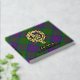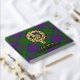 Clan MacDonald crest badge surrounded by a strap and buckle over tartan background. Custom front, back and spine text.