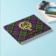 Clan MacDonald of Clanranald crest badge surrounded by a strap and buckle over tartan background. Custom front, back and spine text.