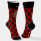 Gregor or MacGregor crest badge surrounded by a strap and buckle over Rob Roy tartan background. Custom top stripe colour. Custom text on each sock.