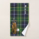 Tartan plaid golf hand towel done in the blue, green, yellow and white Scottish clan MacKellar tartan pattern. Graphics of a brown golf bag with clubs, decorates one corner and custom white text decorates the opposite corner. Personalise the name for yourself or as a great gift idea to your favourite golfer.