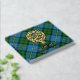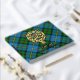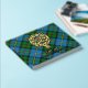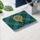 Clan MacLeod crest badge surrounded by a strap and buckle over hunting tartan background. Custom front, back and spine text.