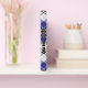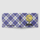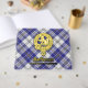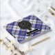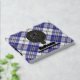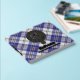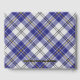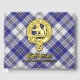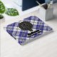 Clan MacPherson crest badge surrounded by a strap and buckle over blue dress tartan background. Custom front, back and spine text.