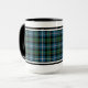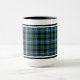 Coffee mug with the hunting tartan for Clan MacRae and its septs, including MacGrath and Ray. Bright blue, green, and black Scottish plaid pattern from 1820, with red and white accents.