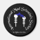 Black magnet with "International Mad Scientist's Society" seal in white script lettering complete with blue fractal spark and Latin motto "En Rabies Est Vox" (In Madness Is Power)