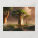 Beautiful and surreal fantasy art postcard features "Madagascar Baobab Forest" with huge trees amid a morning mist