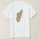An editable title and slogan accompanies the white vertical next to red and green horizontal bands of the Malagasy flag on the front of this t-shirt. The back displays a detailed map of Madagascar.