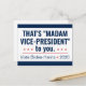 That's "Madam Vice-President" to you. If you're having problems saying Kamala Harris's first name (it's pronounced "Comma-la"), vote Blue and we can all call her "Madam Vice President" or "Ms. Vice-President." Design description: The design area has a white background and a dark blue border on the top and bottom. All letter text is in a sans serif font in the same dark colour as the border. The first line of text reads, "That's 'Madam." The second line of text reads, "Vice-President." The third line of text has three red stars on the left and right of the words, "to you." Below that is a thin red line. The fourth and final line, at the bottom of the design area, reads, "Vote Biden-Harris 2020," with a single, angled red star between "Harris" and "2020." Each line of text is a template. Customise with your preferred colours.