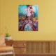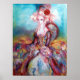 Original watercolor ,acrylic painting with gold foil and iridescent colours on canvas.Vibrant,colourful and unique contemporary art in bright ,red ,pink ,blue white colours .Beautiful sophisticated blonde woman character,sparkling fabrics of a baroque costume with a red rose.