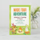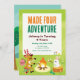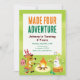 Made Four Adventure. Fourth Birthday Camping Themed Birthday Invitation. Cute bunny and deer illustration roasting s'mores over a campfire. Green and white background. Perfect for your outdoor adventure loving four year old.