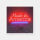A neon sign glows with the words "Made In America" in bold red and blue against a brick wall
