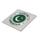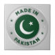 A bevelled looking faux silver ring shape, with the Pakistan flag infused into the center. Around the outside of the infused flag, are the words "Made In Pakistan, with colored star shapes purely for decoration.