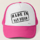 Made In San Diego! Are you from San Diego, California? Do you have a friend or family member who loves San Diego, California? If so, this "Made In..." hat is exactly the gift that you're looking for! The design features a weathered "Made in San Diego" in black stencil-like lettering surrounded by a black rounded rectangle.