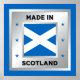 A design which features a faux silver square, which has been designed to look like the inner has been chamfered. In the center of the square, is the Scottish flag. Around the square is the text "Made In Scotland" along with 6 decorative stars.
