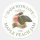 An illustrated peach with leaves and a decorative gold banner across the fruit with the word “bourbon". Editable text “Made With Love and booze (or bourbon)” and two gold hearts. Bourbon Maple Peach Jam.