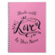 Made with love custom hand lettered recipe spiral notebook. Elegant brush script typography design with your own personalised name. Pink or custom background colour. Handy kitchen book for jotting down cooking and baking recipes. Trendy Birthday or Christmas gift idea for friends and family. Unique handmade design.