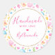 Made with love personalised stickers with a delicious and whimsical pattern. Hearts, love letters, muffins, tulips and cherries bring joy and happiness to this cute little pattern. Pretty pastel colours. A white circle with a faux gold foil border layered over top with your text inside.