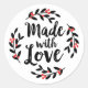 A personalised "made with love" sticker on a white coloured background. Features a pretty berry wreath and the words "made with love" in an elegant script font. A pretty finishing touch for all of your handmade gifts. Designed for you by Blackberry Boulevard.