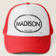 Welcome to Madison! Are you from Madison, Wisconsin? Do you have a friend or family member who loves Madison, Wisconsin? If so, this "Location Location" hat is what you're looking for! The design features "Madison" in big black lettering and "Wisconsin" in tiny black lettering surrounded by two ovals, one thin and one thick.