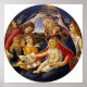Madonna of the Magnificat by Sandro Botticelli, 1483, is a circular tempera painting on wood panel of the Madonna with Christ Child in her lap holding a song book of the Magnificat, the Song of Mary. Surrounding them is a group of youths resembling angels, holding aloft a golden crown radiating light. The round format of the picture is known as a tondo, a format used in some Renaissance religious paintings. The harmonious blue robes and drapery opening onto a view of a cool, Italian landscape give the impression of an otherworldly scene, as if painted on a sphere.