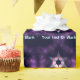A foil-like, multi-coloured, fractal Star of David on a dark blue background.