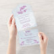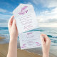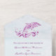 Invite guests to your upcoming wedding with a Magenta Dolphin All in One Wedding Invite. Invite design features a metallic styled dolphin against a muted ocean waves background adorned with elegant scrolls with a perforated RSVP card. Personalise with the groom and bride's names along with the wedding date and location. Additional wedding stationery available with this design as well.