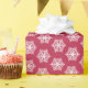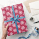 Festive Christmas wrapping paper with magenta and white snowflakes pattern.