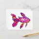 a colourful watercolor design of a very magenta coloured goldfish swimming along on a postcard.