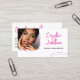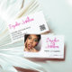 Minimalist photo business card with retro lines in magenta and black against a white background and your name in a rough signature script. Personalise with your photo and a QR code. Influencer QR code business card in white with magenta details and your photo.