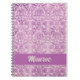 Vintage elegant magenta damask pattern personalised with soft pink name, accentuated with a dark purple drop shadow for contrast. Full and round font for a retro and a bit more fun and modern design, created for the stylish girl who loves the elegance of the damask patterns. This personalised notebook makes a cute everyday accessory to help keep up to date with your to do lists. It is a practical gift anybody can use at home, school or the office.