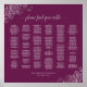 This beautiful wedding seating chart features pale gray text on a magenta plum, cassis purple, or berry colored background with seating assignments for 200-240 guests. It features a simple yet stylish and elegant design with ornate decorative faux foil silver filigree in the corners. The title is written in fancy script calligraphy and reads: Please find your table.