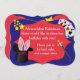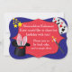 Fun magic birthday party invitation in red, purple, yellow, black and white. Complete with magic wand, cards, stars, and rabbit in a hat.