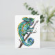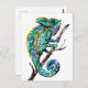 traditional watercolor and ink artwork of a chameleon in blue and green colours on a postcard
