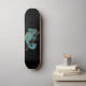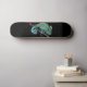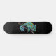 traditional watercolor and ink artwork of a green and blue colored chameleon on a black skateboard