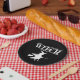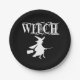 A set of paper plates with a white icon shape of a flying witch on a broomstick and a black spiderweb decorated text above on a black background. A stylish spooky design not only for your Halloween party but also for every fun fairy, magic or horror themed party throughout the year. To match the background colour of the paper plates with your own party colour scheme simply click the 'Customise it!' button and select a colour in the 'Printed Background Colour' chart.
