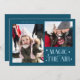 Minimal and modern holiday photo template card featuring 2 photos on the front with a typography text that says "magic in the air" with stars. You can also add another picture and message on the back. The background is teal.