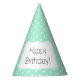 Magic mint and white polka dot pattern birthday party paper hats. The design features a white polka dot pattern on mint green and a white shape in the middle with your custom text.