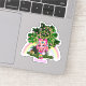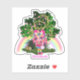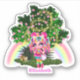 A sheet of 1 clear peel off sticker with a graphic illustration of a beautiful rainbow coloured haired fairy with pretty blue eyes clutching a unicorn bag walking across a garden filled with pretty string lights, sakura cherry blossoms, a colourful rainbow and magic fairy dust. She has a pink template below her for your name. Ideal for little girls birthday party favour packs or for school books and lunch boxes.