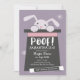 Perfect magic theme birthday party invitation for your child! It's an illustration of a cute bunny rabbit peaking out of a black top hat. The text inside the hat says "poof!" and the party information follows. The back of the card is in polka dots. Great for girl's birthday party with dusty pink and purple colours.