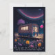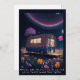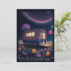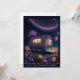 Whimsical flat greeting card for book lovers features AI generated digital art dreamscape with a illuminated bookmobile in a field of flowers under a night sky. "Meet me under the stars and we can read all our favorite banned books together" text can be customized to your own special message
